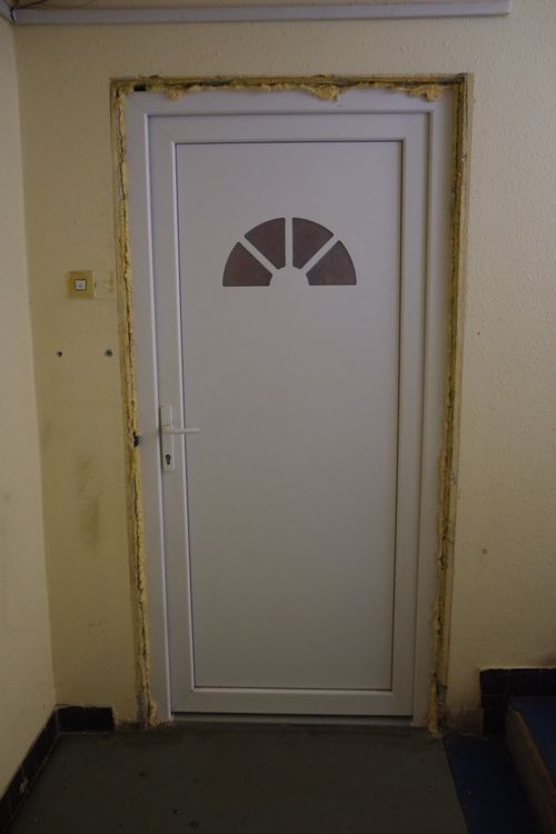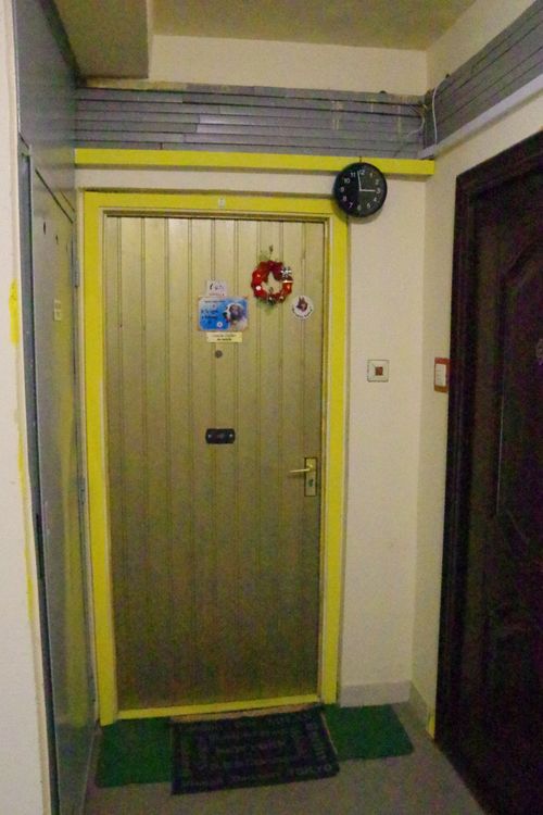 A két szép új bejárati ajtó, a fehéren még ünnepi dísz, fehér tollkoszorú is, ugyanakkor a felvezető lépcsősor mellett pereg a falról az olajfesték, a két ajtó felett a sarokban lóg a vezeték.