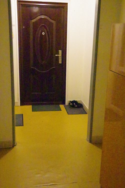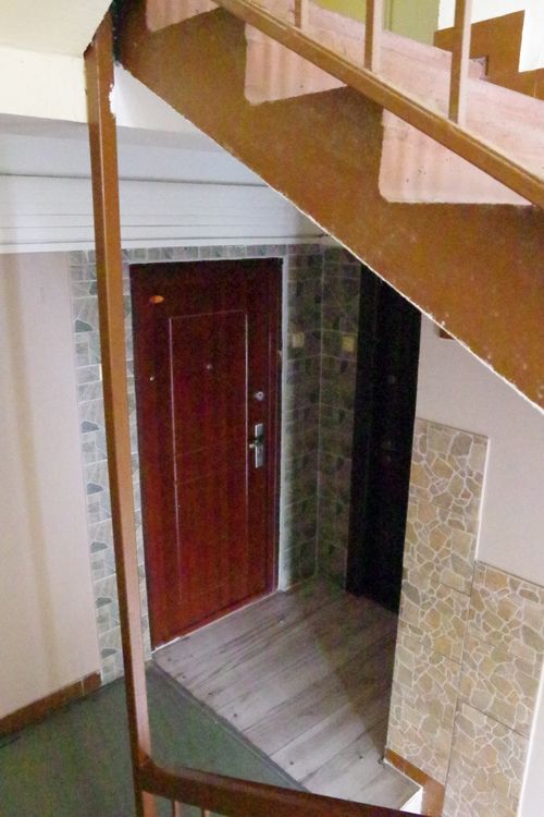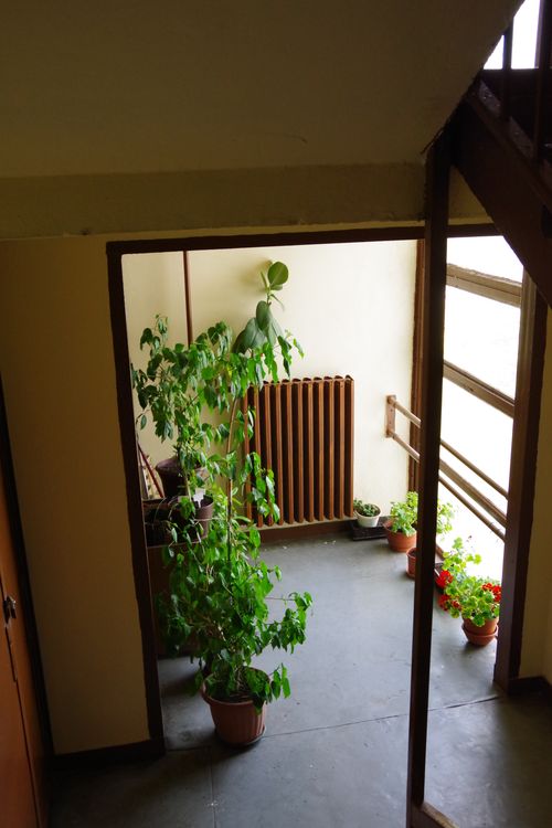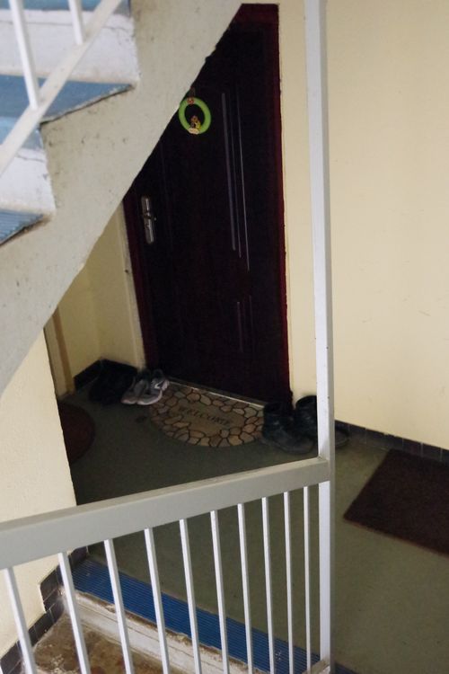 A bejárati ajtón kívül levetett, szabadon heverő utcai inkább azt mutatják, az ott lakó nem húz éles határvonalat magán és köz között. A baloldali kép a lépcsőházból leágazó folyosó kanyar utáni végét mutatja, nem gyakran téved arra véletlenül bárki. Csakhogy a másik képen a lépcsőforduló mellett hevernek a cipők, ami arra vall, viselőik biztonságban érzik a lábbeliket, nem gondolják, hogy ellopná őket bárki vagy kárt tenne bennük. Alighanem a lépcsőház iránti bizalom az oka annak, hogy aránylag kevés ráccsal elzárt lakást találtam. Lépcsőháztól ajtóval elzárt folyosószakaszt egyetlen házban találtam, de ott minden emeleten. A lépcsőház iránti bizalmatlanság egyedül ezt a házat jellemezte. Az ajtók különbözősége, az esetlegesség, hogy vannak-e mellette csengők, azt mutatja, mindezt nem a tervezők gondolták el így, hanem időközben a lakók.