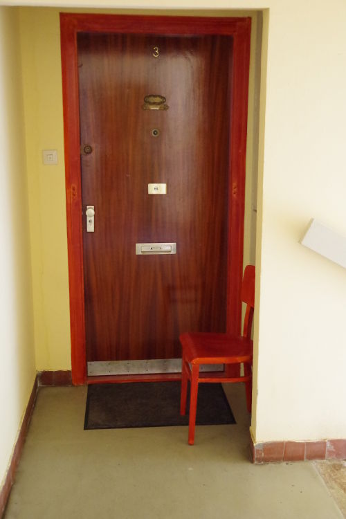 A képen nem keríti el rács a lakás előtti beugrót. Benne szék, amely elférne az előszobában is, nem volna fáradság alkalmanként onnan tenni ki az ajtó elé. Ittlétéből arra következtessünk, hogy szívesen és gyakran elüldögél rajta a lakó az ajtaja előtt? Kilátás sehová, semmire nem nyílik a székről, sem hamutartót nem láttam mellette (ami nem szól ellene annak, hogy akár dohányozhatnék is ott valaki), sem cipőt (amelynek felvételében segítene, hogy ül). Talán telefonálni ül ki rá valaki, hogy ne zavarja vele a lakótársait. Ez érthetővé tenné, miért marad a fülkében a szék. A fülke elrendezése letisztult, minimalista, a hely ápolt, gondozott. A szék és az ajtókeret azonos színű vagy pácolású - lehet, hogy szándékosan. Nem kizárt, hogy amikor üldögél rajta, akkor megfordítja vagy kiteszi a fülkéből a széket a lakó - igaz, ezzel az erővel az előszobából is kitehetné, tehát ott is tarthatná. Lehet, hogy arra szolgál a szék, hogy rátegye a táskáját, így könnyebb előveheti belőle a lakáskulcsot? A bejárati ajtó a lakásba nyílik, így abból, hogy szék van a fülkében, nem következtethetünk rá, távol vagy otthon vannak-e a lakásban.