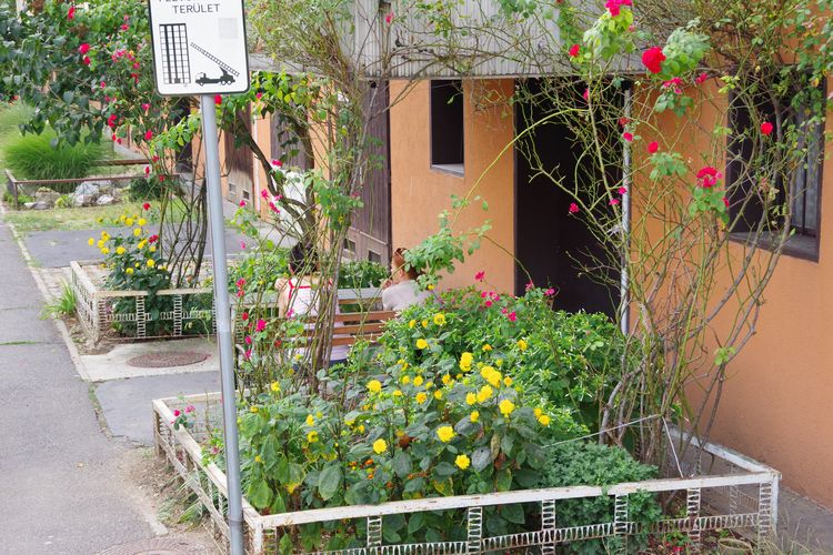 Dohányzóhely a pad a kapu előtt, társaságba, társalgásra hív, a füst a szabadba száll. A mellette kialakított kisebb virágoskert az otthonosság érzetével enged belépni az épületbe.