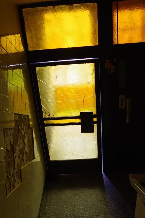 A csonkhoz illik a levert, lepergett vakolat a csengő és az új ajtó mellett. Távolabb, a beugróban új tölgyfaajtó, mellette a vakolat és a fal alját szegélyező csempesor hasonlóképp megrongálódott. Egyazon látómezőben a gondozott és az elhanyagolt. Az új az elhasználódott keretében.