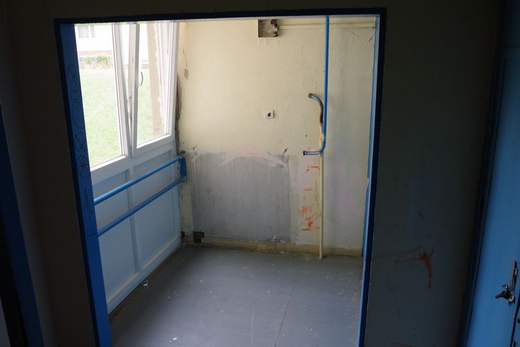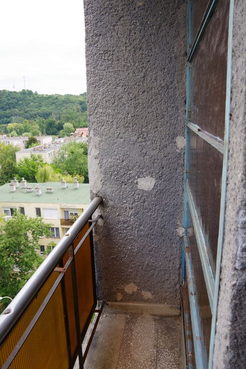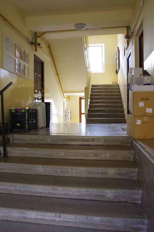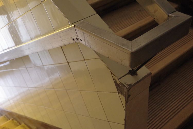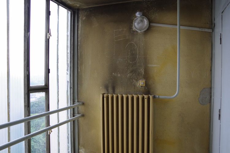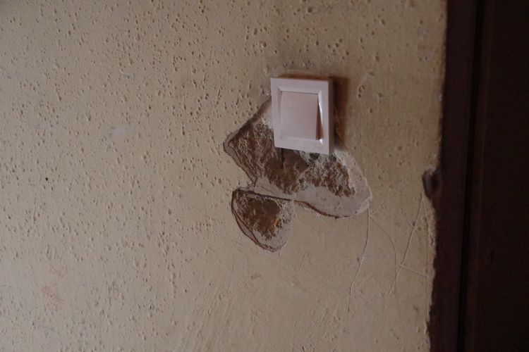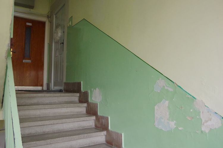 A nemrég felszerelt új kapcsoló mellett levált a vakolat. A lépcsőforduló fémkorlátja alatt a sarkoknál törött a csempeburkolat. Az elhanyagoltság nem puszta látvány, tapinthatja, aki felkapcsolja a villanyt vagy kapaszkodik a korlátba.