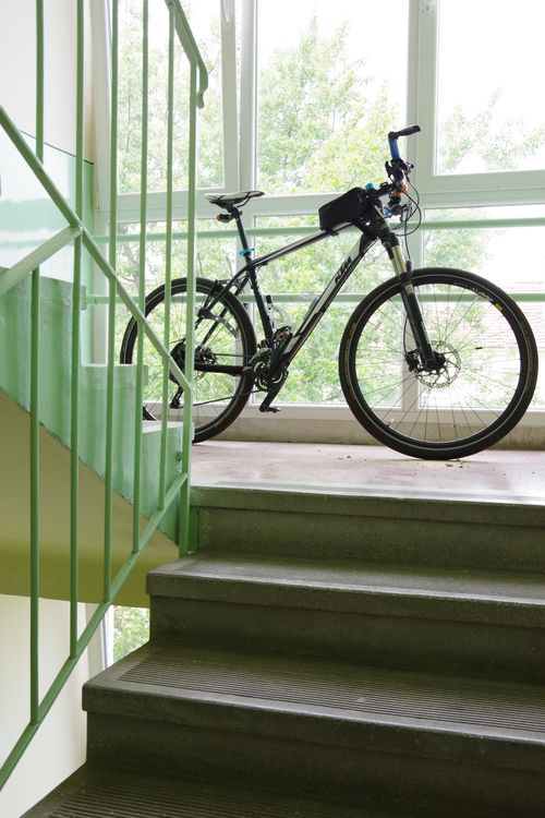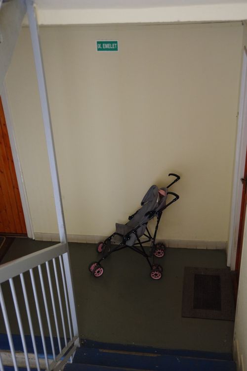 Kerékpár és babakocsi is felbukkannak a lépcsőház járóterében. Ez azt jelzi, nincs tárolóhely az épületben ezek számára (valahol a földszinten keresnénk). A lakások tervezésekor aligha gondoltak kisgyerekes családokra. A babakocsit liftes házban hagyták elől, így csak az emelet lakóinak kell kerülgetni. A kerékpár a legfelső lépcsőfordulónál áll egy négyemeletes lift nélküli házban, így csak a legfelső szint lakói számára jelenthet akadályt. Biztonságérzetről vall, hogy lánc nélkül, szabadon áll mind a kettő.