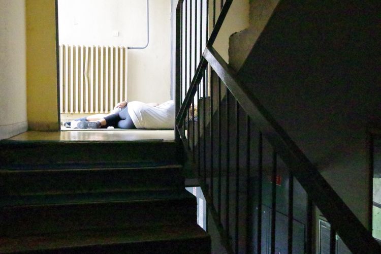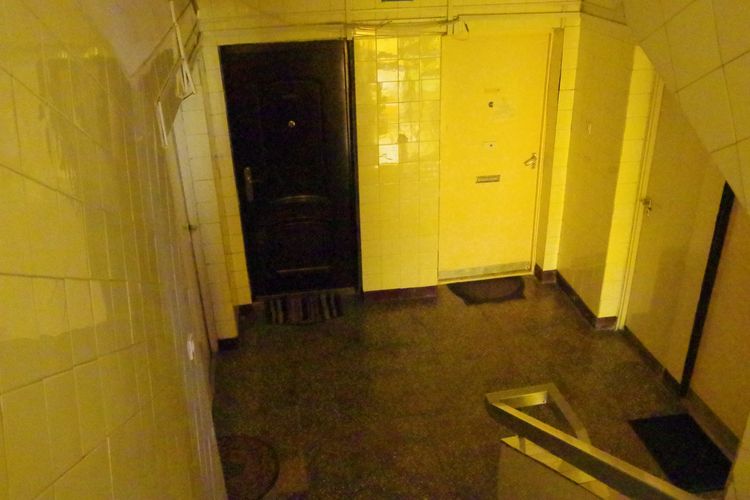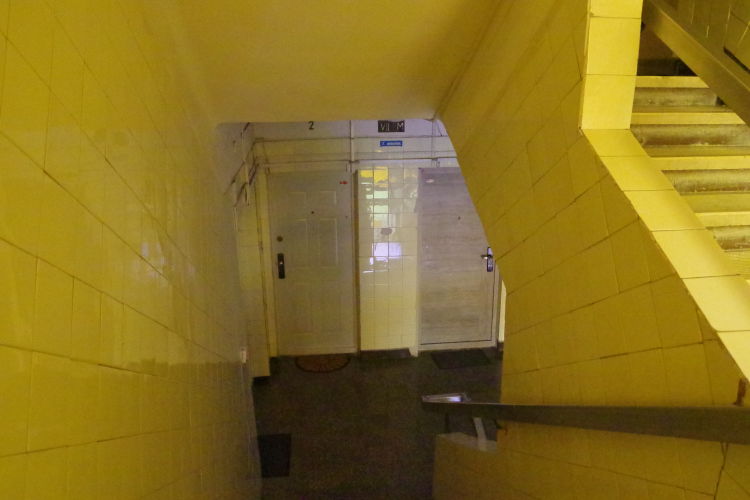 Fedélnélküli pár talált benne pihenő helyet. A fényképen egymást átölelve békésen alszanak. A felvétel idején épp esett az eső. De mi ez a fülke, hogy nincsenek senkinek az útjában? A házban, mint több másikban is a környéken, a lift nem a lakószinteken áll meg, hanem a szintek között félúton, ráadásul nem is minden, hanem csupán minden második félszinten. Ahol megáll, ott egy beugróba (kilépőbe, fülkébe) lép ki az utas, amelynek az egyik oldala a lépcsőházba nyílik, annak mintegy toldalékaként, járulékaként, kihasasodásaként, ahogyan a képen látszik is. Így fél emeletet lépcsőzve jut majd el ki-ki a lakásához. Mindenkinek lépcsőznie kell – vagy lefelé, vagy felfelé, de egyik irányban biztosan. Mivel nem lehet minden fél szintnél kiszállni, ezért nem érdemes a korábbi vagy későbbi kiszállást választani csupán azért, hogy a nem kívánt lépcsőzési irányt elkerülje valaki, különben három félszintet kellene gyalogolnia, nem egyet. A tervezők aligha gondoltak az idős emberekre, akiknek minden lépcsőfok külön fájdalom.