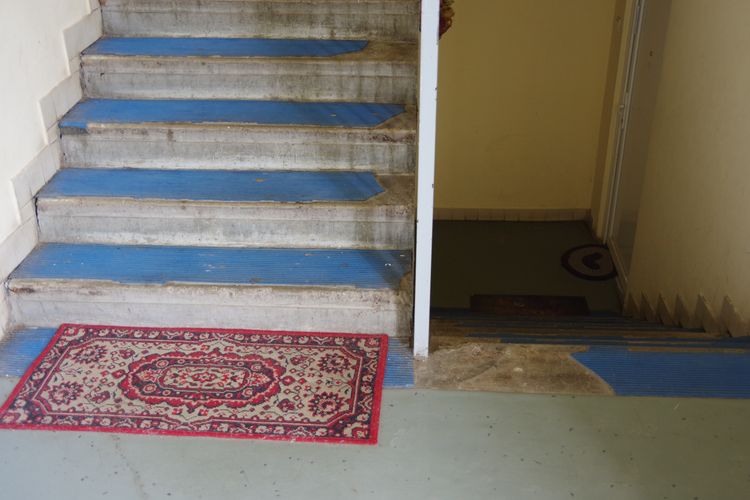 A lépcsőfordulónál a gondosan elhelyezett szőnyeg mellett több helyen lekopott a lépcsőfokokról a burkolat.