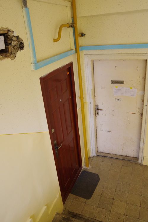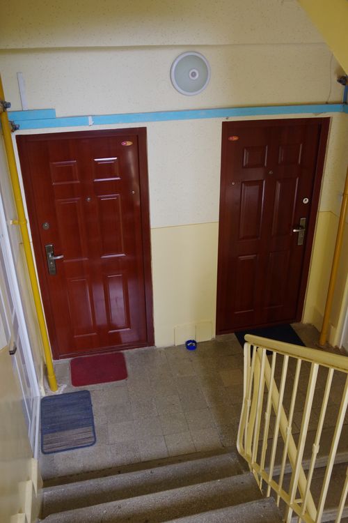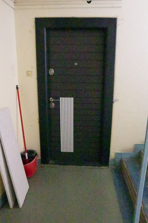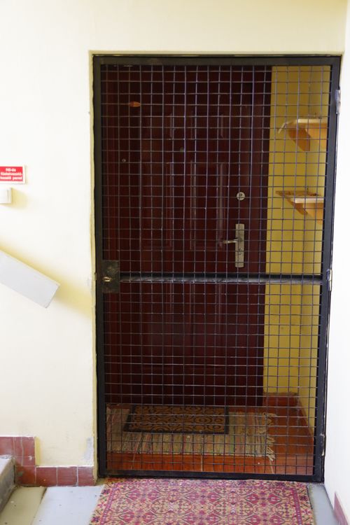Az új ajtók beillesztése és közvetlen környezete különbséget mutat. Azt jelzi, minden lakó különféleképp ítéli meg és dönt róla, milyen határig nyúlik, nyúlhat, nyúljék az önmagáról kínált kép. A két szélsőség. Nem ritka, hogy az új, lecserélt ajtó és ajtótok körül eldolgozatlan a purhab szigetelés vagy kijavítatlan a sérült vakolat. A másik véglet az egyedi kialakítású műkő falburkolat és járólap, amely a lakás előtti beugrón (fülkén) is túlnyúlik. Figyelemre méltó, hogy az utóbbi, így átalakított területet nem védi rács.