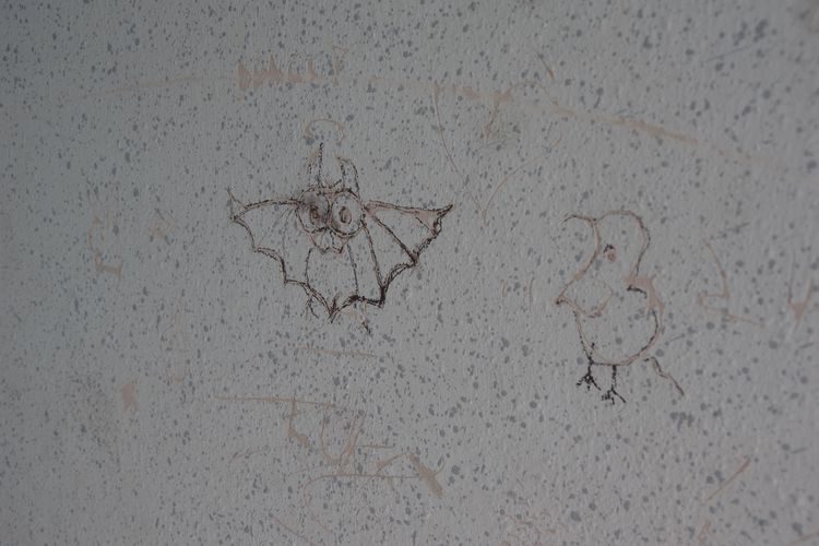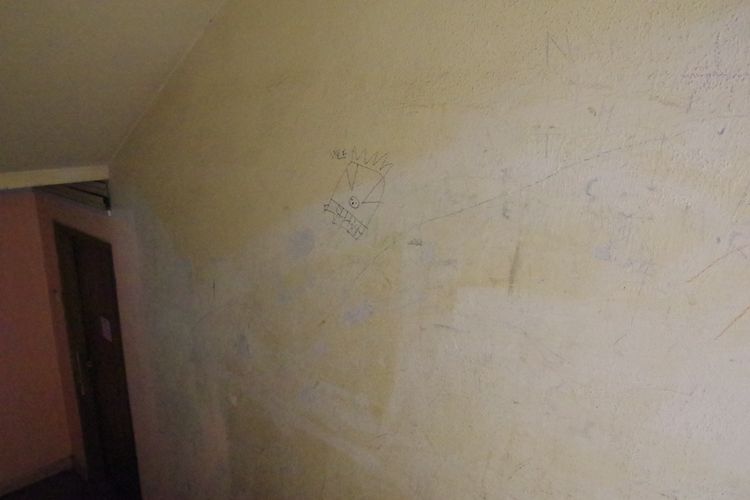 Kevés a graffiti, igaz, a rossz minőségű falfelületek sem kínálják magukat és a távlat hiánya sem enged nagyobb méretű alkotást. Apróbb, Kodolko-szobor méretű falfirkák, írások jelennek meg.