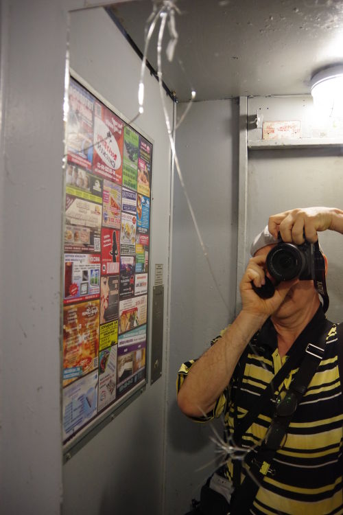 Behatolás maga ez a fényképösszeállítás, akkor is, ha sehol nem találkoztam fényképezést tiltó táblával. A liftben készült önarckép azt is tanúsíthatja, menyire szűkös a hely. Kétgyerekes család már nem tud együtt utazni. Babakocsival egy szülő vagy bevásárló kézikocsival egy ember épp, hogy elfér. Úgy fest, egyedülálló fiatalokra, gyermektelen párokra és inkább középkorúakra tervezték. A tükör repedt. Nem biztos, hogy rongálás miatt. Lehet, hogy véletlenül ütődött hozzá valami, amit egy utas vitt, aki nem volt ura a szűkös térnek. Repedt tükörrel is szállít az eszköz, így is látni benne magunkat, már ha egyáltalán belenézünk evégett. Aligha cserélik ki egyhamar. Azért kerültem a liftbe, mert a kilenc-, tízemeletes épületek lépcsőházat a legfelső szintről kezdtem el fényképezni, ahová lifttel mentem fel. Nem vállalkoztam rá, hogy alulról felfelé gyalogoljak a lépcsőkön.
