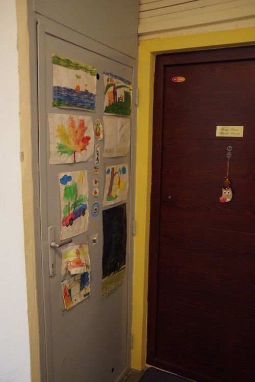 Az egyik emeleten matricák vezetik a gyermek tekintetét a lift és a bejárati ajtó között. A liftes beugró ablakán üvegmatrica fogad. Ha a lépcső felé fordulunk, lejjebb, a lakásszint falán pillangómatricákból alkotott csokor fogad, a lépcsőút után a lakás felé fordulva, már látszanak a bejárati ajtó előtt, a beugró falán a gyermek saját rajzai.