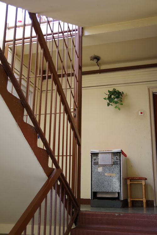 Behatol a lépcsőházba a házban működő utcai üzlet, amikor göngyölegeit a kapualjban rakja le, ha rendezetten, ha ideiglenesen is. A képen látható épületben nincs lift. A tágasság és a távlat lakótelepi lépcsőházakban ritkán tapasztalható élményét kínálja. A lépcsőfordulók ablakai bevilágítják a teljes kapualjat, amely így szabad, levegős, dinamikus tér lesz, izgalmas járásokat kínál, belépve felfelé vezeti a tekintetet. A lift nélküli házak lépcsőházaira általában is áll, hogy verőfényesebbek, világosabbak a liftes ház lépcsőházaihoz képest (például amelyet az alvó fedélnélküliek képén látni). Szembeötlő amannak szűkös, szorongató, sötét tere, ahová csak fülkék sötét faláról visszaverődve jut el természetes fény és amelyet különben többnyire búra nélküli lámpatestekben árválkodó villanykörték világítanak meg.