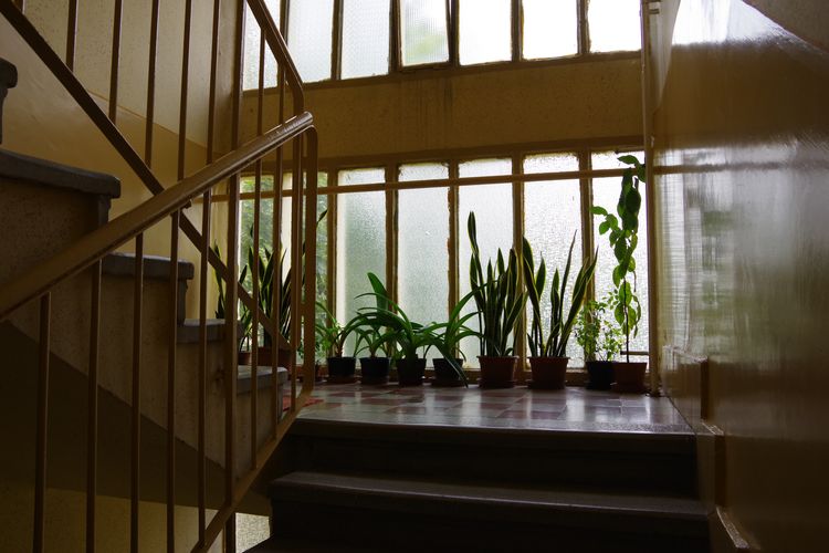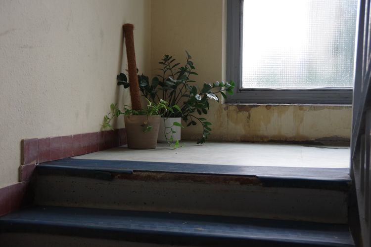 A gonddal ápolt, zöldellő növény mellett mállott, beázott vakolat, a lépcső élénél levált burkolat.