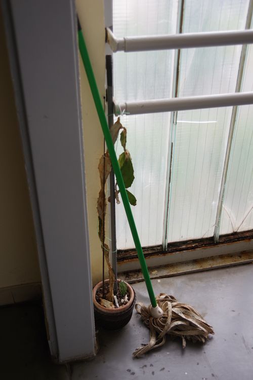 Kinek kellene elvégezni az elhúzódó javításokat? A rozsdás antennát talán annak kellene, kellett volna leszerelnie, aki felszereltette a saját lakásához, ám aki alighanem már elköltözött. A lógó vezetéket az a szerelő is visszabújtathatta volna a műanyag csatornába, aki – mint azt az ajtó felső sarkánál látni -bevezette a kábelt a lakásba. Az újonnan felszerelt konnektor körül a levert vakolatot a villanyszerelő is pótolhatta volna. De mind inkább elbátortalanodom. Mert – a korábbi fényképekre gondolva - kire tartozik az eltört csempe, a lemállott védőfesték, hát még a virág mellett az ablak alatt a beázott és lemállott vakolat megjavíttatása?! Kinek kellene megrendelnie a munkát és legfőképp kifizetnie a javításokat? Aligha a legközelebbi lakás lakójának. A lépcsőházban számtalan hasonló javítandó feladat akad. A megoldatlansághoz bizonyosan hozzájárul a ház tulajdonosi szerkezete (ki mit milyen értelemben és mértékben érez a sajátjának), a lakók financiális helyzete, amely korlátot szab a közös költségnek, továbbá a viszonyokon és a körülményeken nevelődött érzékek is, amelyek alighanem eltompultak vagy legalábbis fáradtak jelezni a teendőket.
