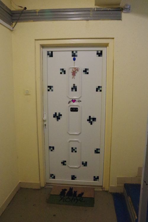 Egy helyütt találtam képet a falon. A kettő stílusa rokon, alighanem ugyanaz a lakó helyezte el őket, egyazon ajtó környezetében vannak, az egyik az ajtó mellett, a másik abban a liftes beugróban, amely a lakásra nyílik.
