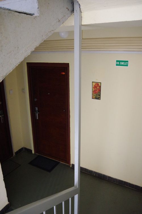 A gondosan felületkezelt tölgyfaajtók nehezen vezethetők le a tömeglakások betonelemeiből, éppígy a folyosók falainak, járófelületeinek a textúráiból. Az alsó négy-öt emeleten sűrűbben találkozni ilyen ajtókkal, mint a magasabban fekvő lakásoknál. A liftbe nem fér be, ám alig hihető, hogy ne akadnának olyan markos szállítók, akik ne tudnák öt emeletnél magasabbra felvinni.