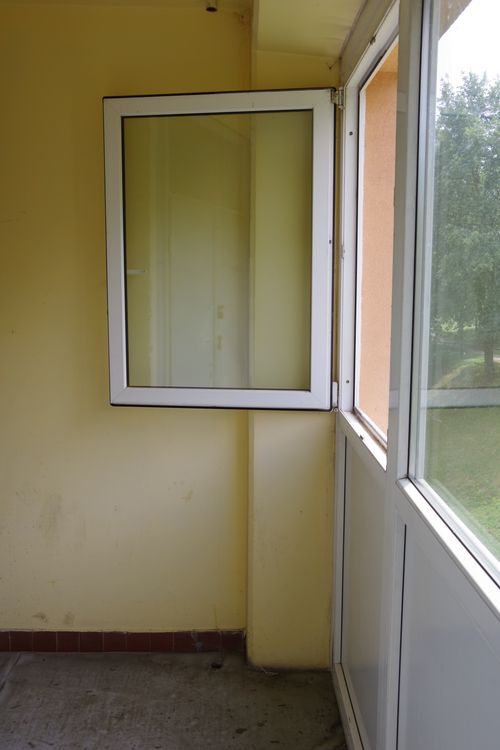 Van épület, ahol kicsi, loggia szerű állóhelyet terveztek, alighanem dohányosoknak, bár hamutartót, szemetest nem találni benne. Egy, legfeljebb két ember fér el állva, a füst a szabadba megy. A házban a lift az emeletek közötti lépcsőfordulóknál áll meg, minden félszinten. A liftajtó mellől nyílik a tartózkodótér üvegbetétes csapóajtaja. Az ajtó üvegén át érkező sárgás, meleg fény deríti a fehér csempével burkolt lépcsőházat, érdekes teret alakít ki benne. A kilépő, miként a lépcsőház burkolata és az ajtó üvege is, kopottas, töredezett. A szabad tér falán pótolták a lyukakat, ami gondozásra vall. Ugyanez a függőleges loggiasor a rárakódott szennyeződéssekkel, a lepergett vakolatrészekkel kívülről sokkal elhanyagoltabbnak fest, mint belülről.